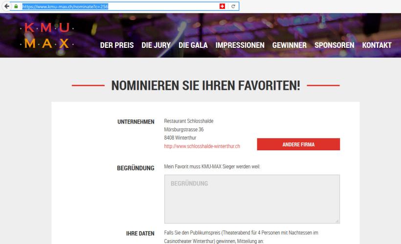 Achtung: wenn der Name Ihrer Firma nicht erscheint, sind evtl. nicht Mitglied beim KMU-Verband oder wurden noch nie nominiert. In diesem Falle müssen Sie sich zuerst einmal nominieren lassen. Nach der ersten Nomination wird ihre Firma gespeichert und erscheint im Auswahlmenü.
